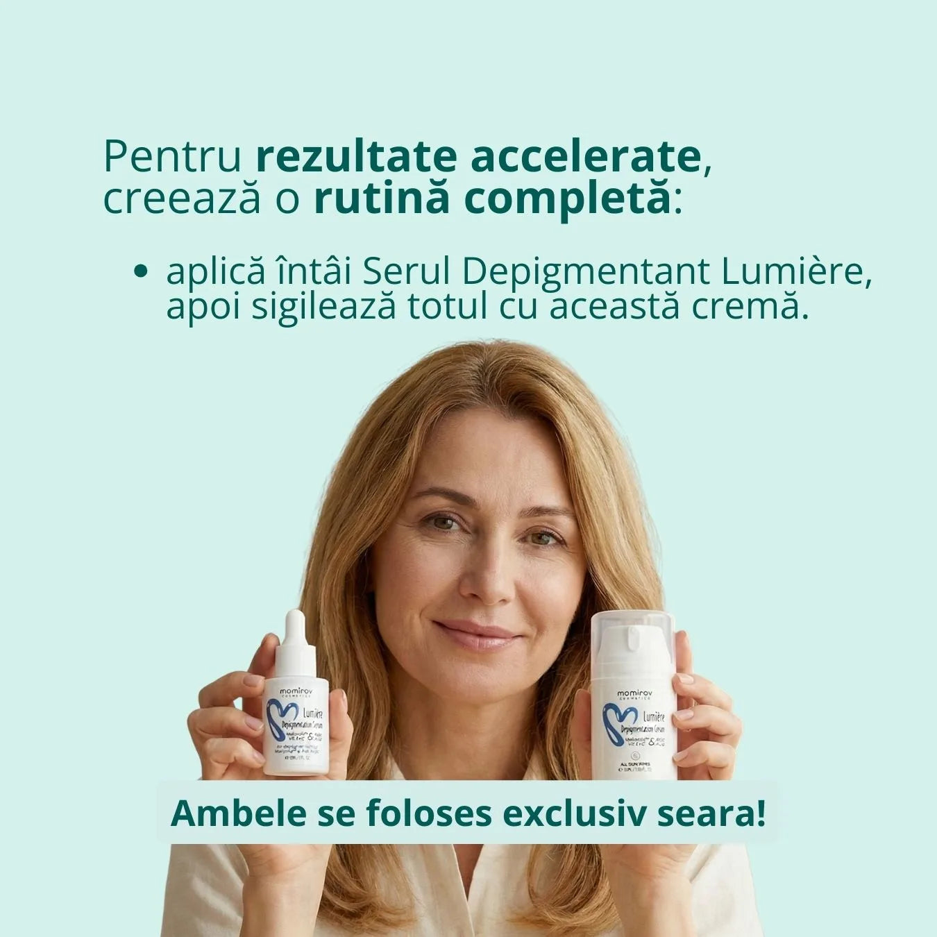 Nu este obligatoriu, dar este foarte recomandat pentru rezultate mai rapide. Serul are o textură fluidă care pătrunde adânc în piele, în timp ce crema sigilează tratamentul la suprafață. Împreună, acționează sinergic pentru a "șterge" petele mult mai eficient.