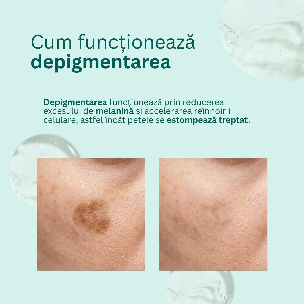 Depigmentarea este un proces care necesită răbdare și constanță. Deși pielea va fi mai luminoasă și fină după primele utilizări, estomparea vizibilă a petelor pigmentare apare, de regulă, după câteva săptămâni de utilizare zilnică (seara), în funcție de vechimea și profunzimea acestora.