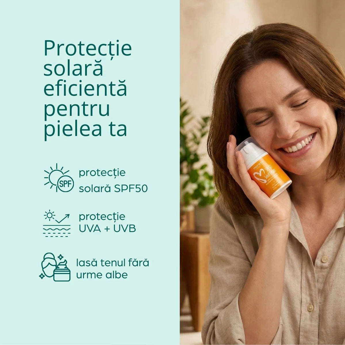 Nu. Formula noastră a fost creată special pentru a fi invizibilă. Se absoarbe rapid în piele fără să lase acea peliculă albă inestetică sau senzația de „mască”