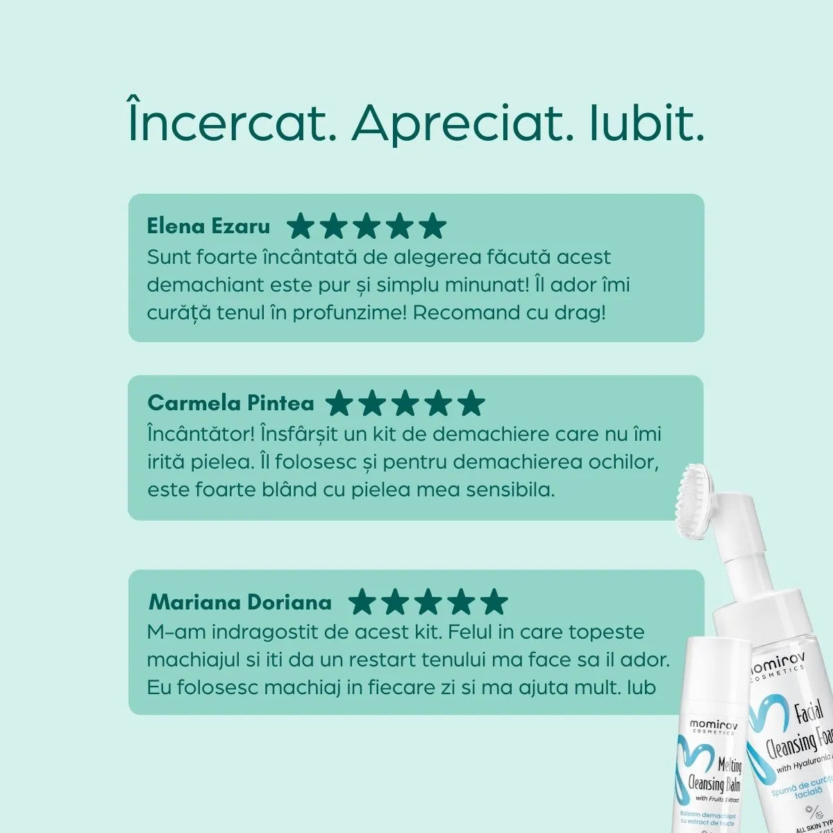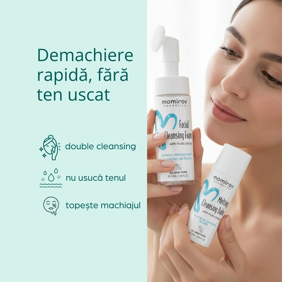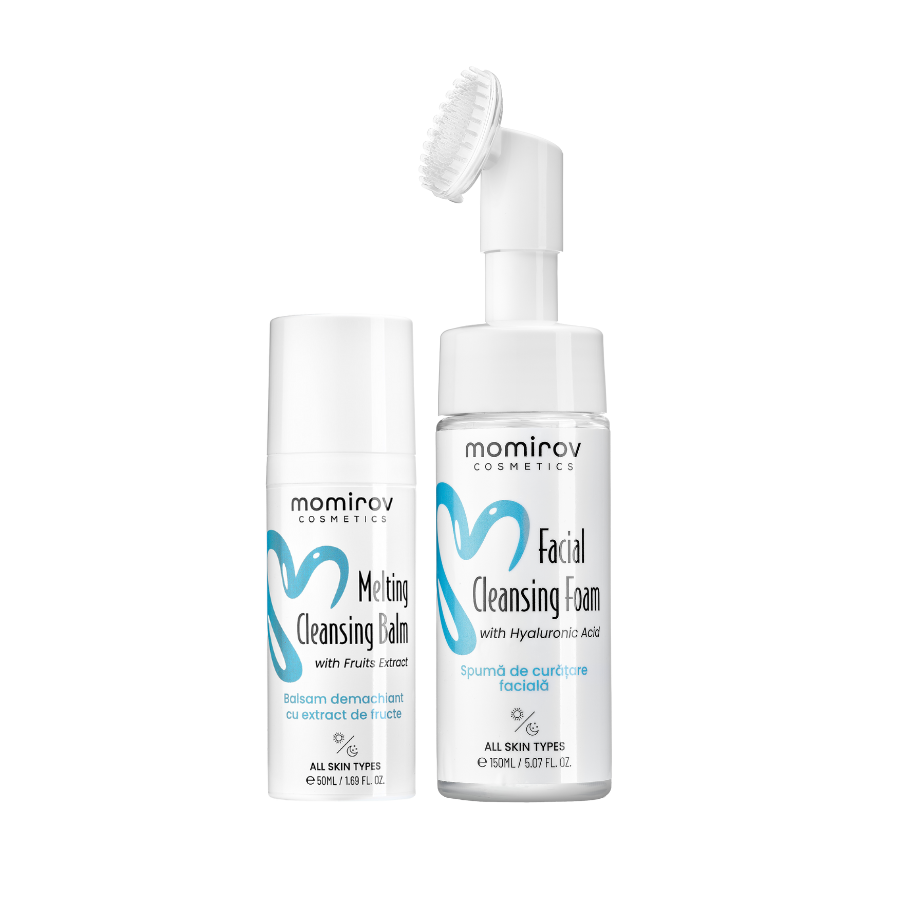 Rutina perfectă de îngrijire a pielii cu acest Kit demachiant în 2 minute de la Momirov Cosmetics. Acest kit esențial include două produse inovatoare: Balsamul Demachiant cu Extract de Fructe și Spuma de Curățare cu Perie Inclusă, asigurând o demachiere rapidă, eficientă și completă în doar două minute.