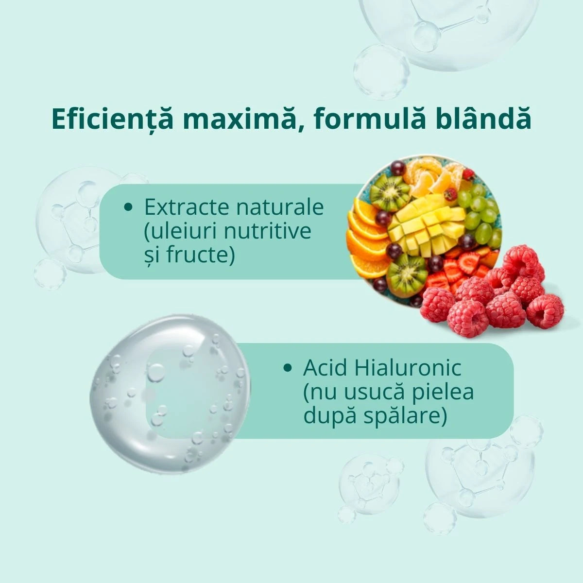 Spre deosebire de demachiantele agresive, acest kit protejează bariera naturală a pielii. Ingredientele precum acidul hialuronic (din spumă) și uleiurile naturale plus extractele de fructe (din balsam) lasă pielea hidratată și catifelată, eliminând senzația de „piele care ține” după spălare.