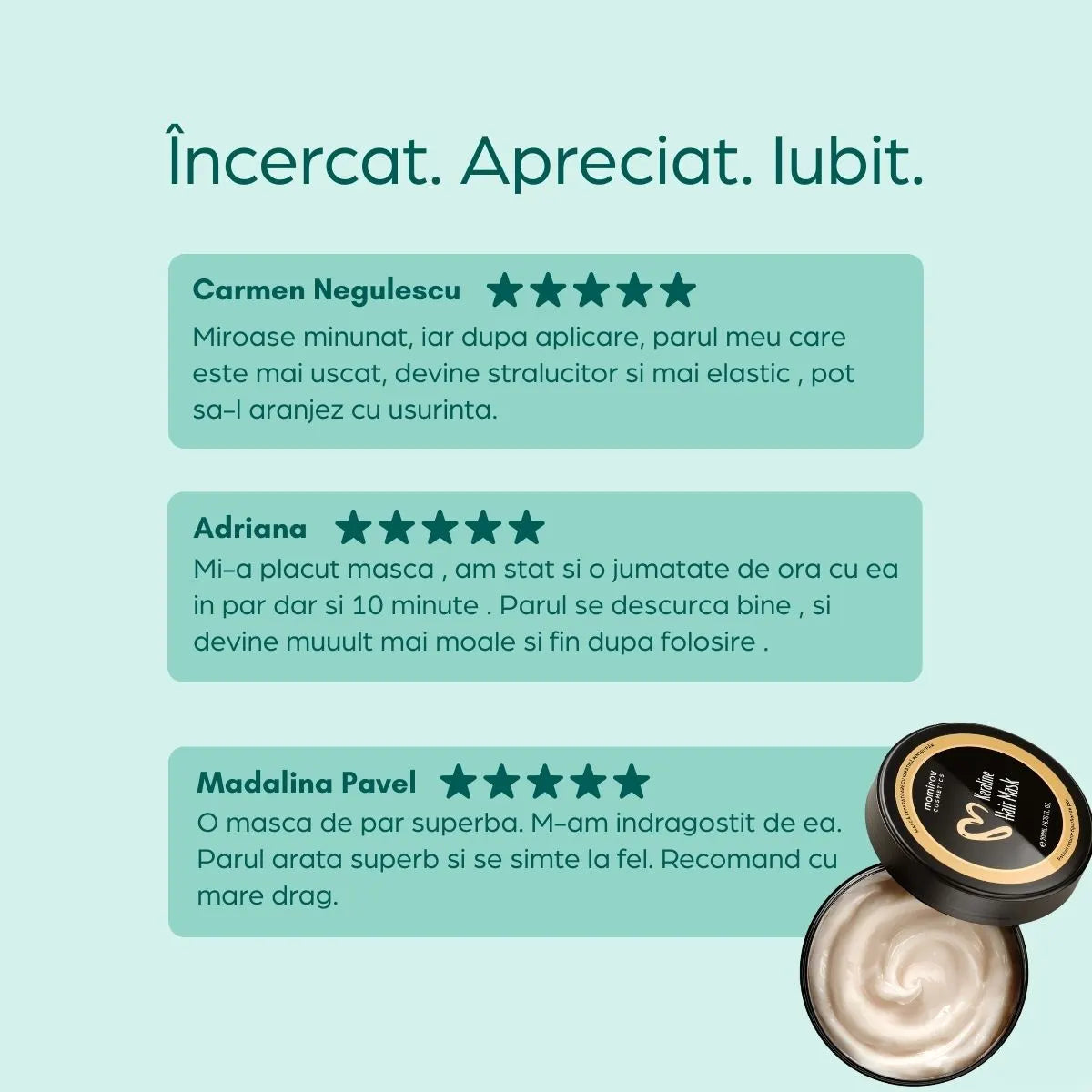 Pentru o hidratare profundă și repararea structurii firului de păr, se recomandă să lași masca să acționeze timp de 10 minute pe părul umed, proaspăt spălat.