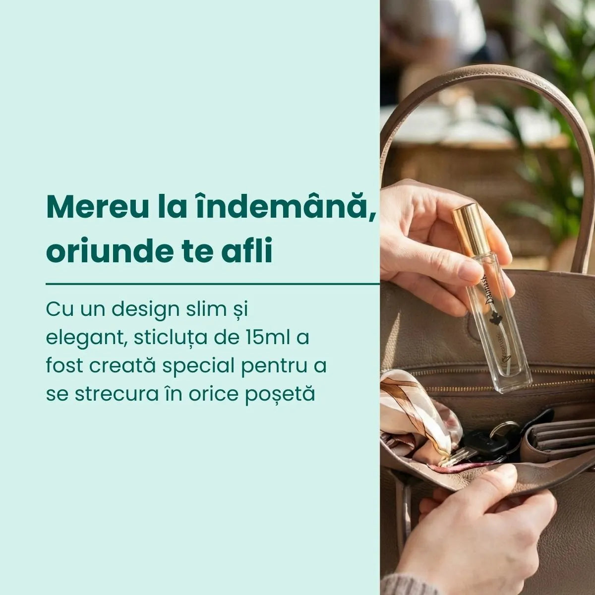 Centrul parfumului este dominat de puritate și eleganță. Florile albe precum iasomia și lăcrămioarele creează o textură catifelată, perfect echilibrată de notele sofisticate de iris.