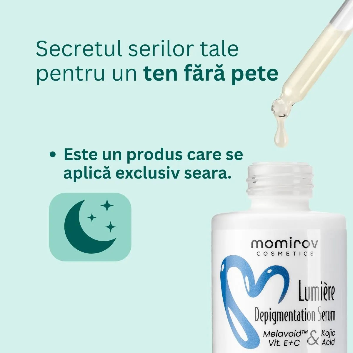 Serul funcționează excelent singur, dar pentru un efect accelerat de iluminare și hidratare, recomandăm utilizarea lui împreună cu Crema Depigmentantă Lumière. Ordinea corectă seara este: curățare -> Ser Lumière -> Cremă Lumière.