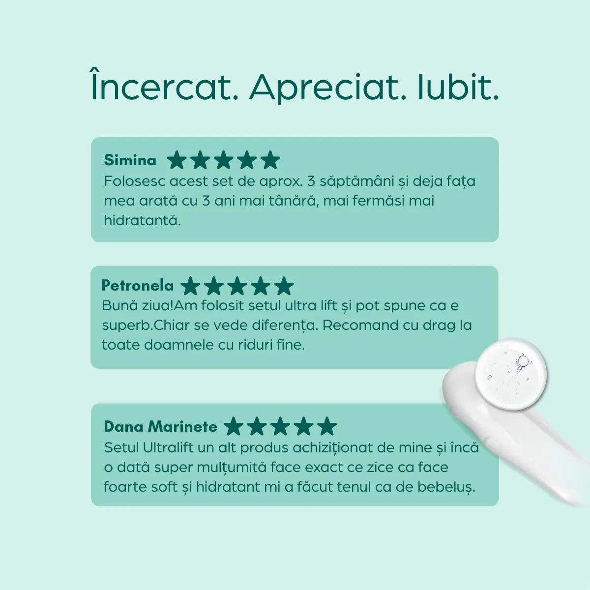 Un mit comun este că produsele antirid eficiente trebuie să fie dense, uleioase și grele pe față. Setul Ultralift demontează acest mit. Formula sa ușoară se absoarbe aproape instantaneu, lăsând tenul matifiat natural și extrem de fin la atingere.